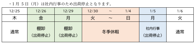 棚卸による出荷停止日 並びに 冬季休暇のご案内